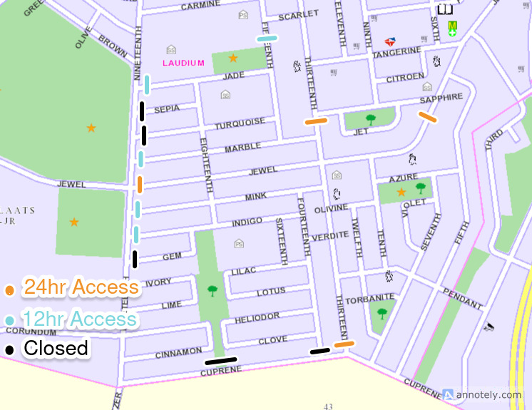 - Orange: Gates that have 24 hour manned access control